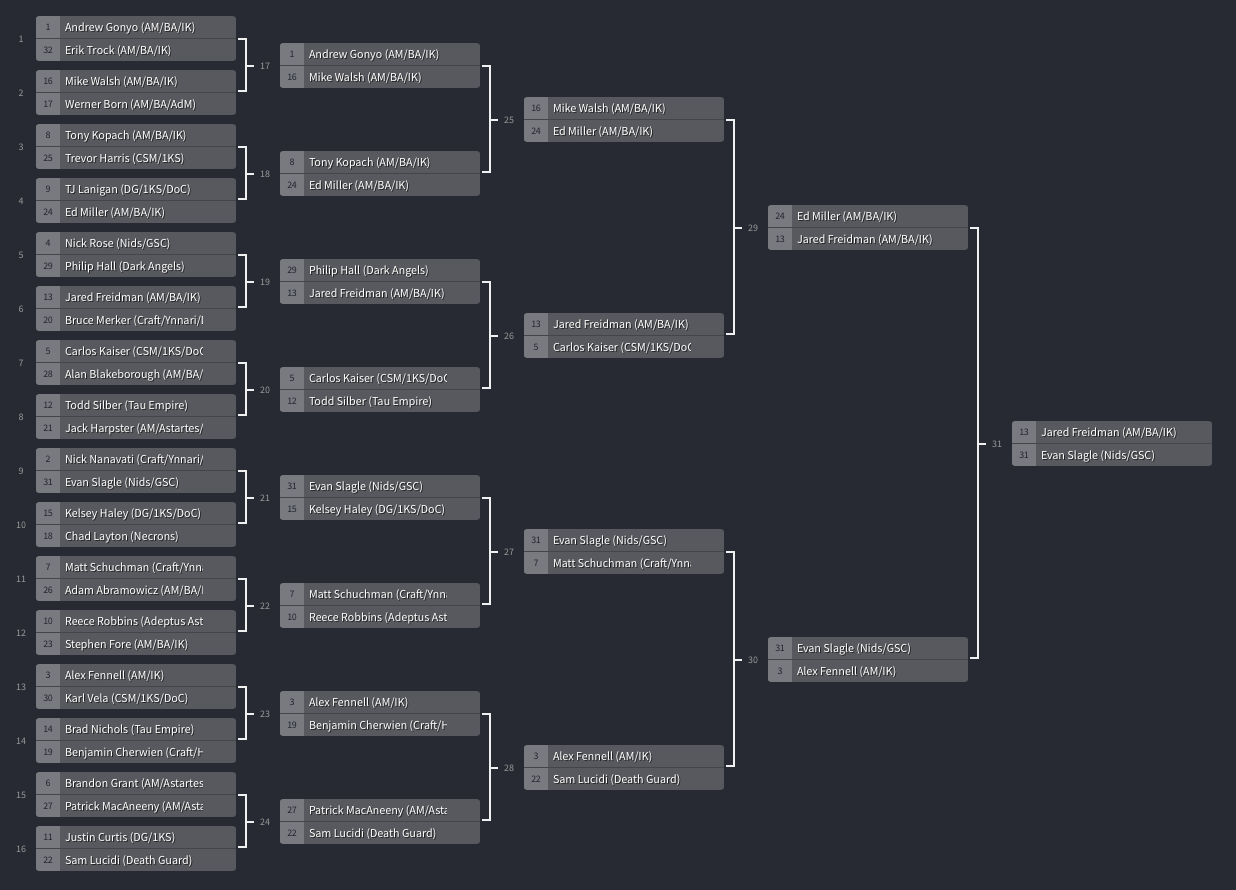I’ve never been good at them (though once, by accident, I nearly won an NCAA pool) and beyond that, with as random a game as 40K is, I don’t think the failure of any given bracket actually indicates a failure of that prediction method to work. So instead, I’ve made two what I call “benchmark” brackets – brackets based of randomness that can serve as comparators to people’s actual brackets, if they’re so interested.