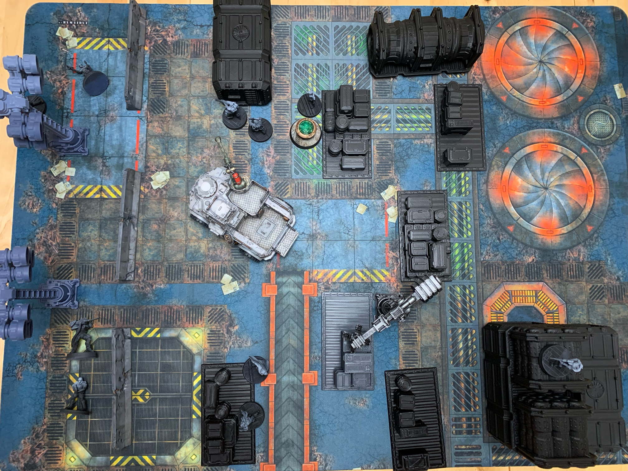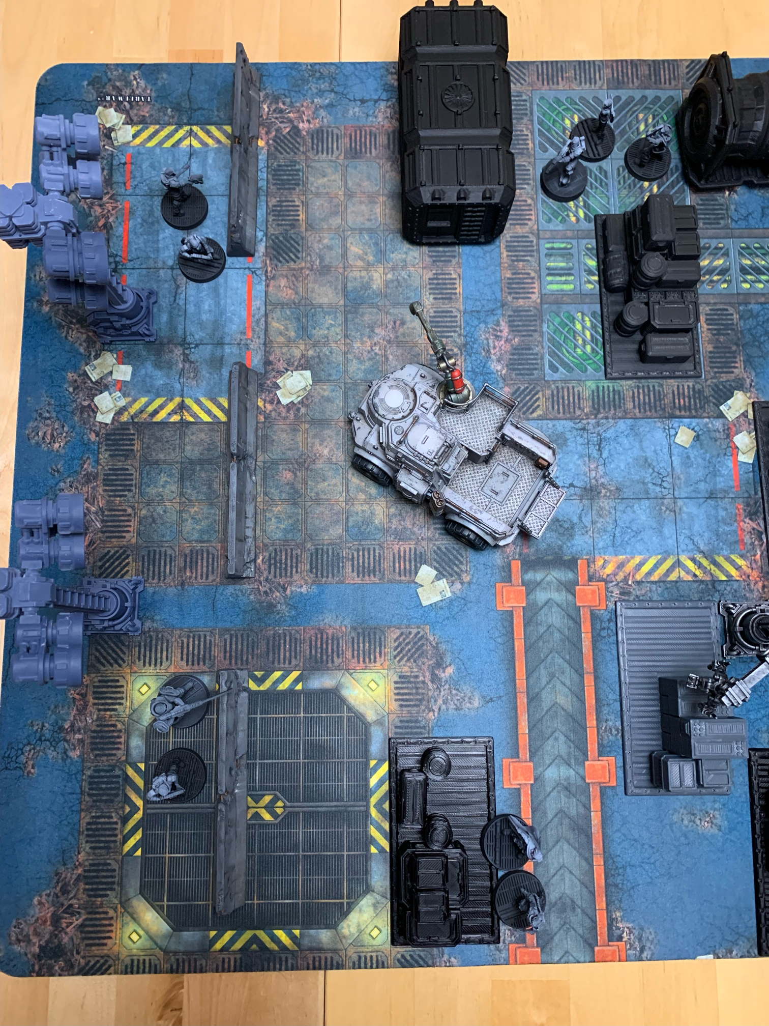 I set up the table on a reasonably sized battle mat, reminding myself to buy more (I have a problem) that looked appropriate for a dockyard, with our Corporate Security force set up in an enviable position – in cover, where they need to be, able to aim instead of moving into position. My group on the other hand skulks about in the shadows at the far end.